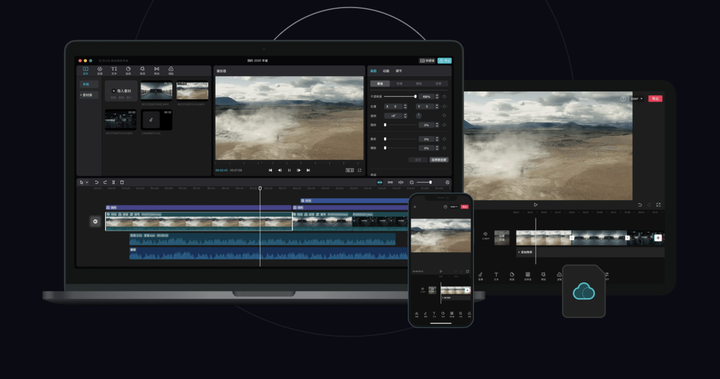 在AI技术的支持下智能字幕、曲线变速、智能抠像、文本朗读等功能极大的提高了工作效率,内置海量的素材(音频、贴纸、花字、特效、滤镜等),满足各类创作需求。
